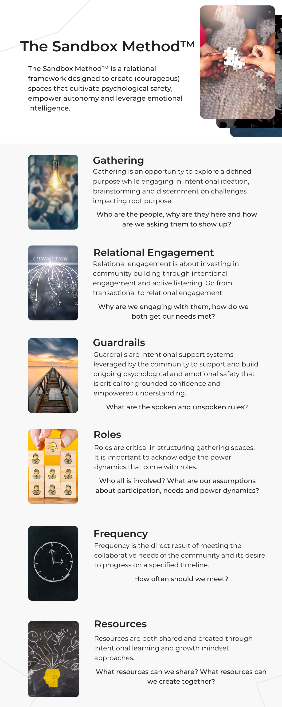 The Sandbox Method™ is a relational framework designed to support benevolent gatherings that cultivate psychological safety, with intentions to leverage emotional intelligence and empower autonomy.